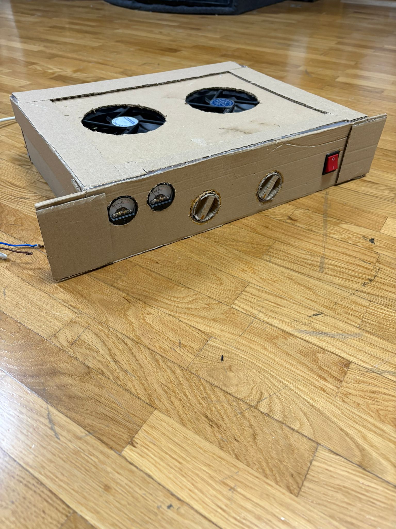 The amplifier housing is made of cardboard. Inside is an old repaired car amplifier with modified speaker connections and a 12V converter. The amplifier has a power of 500W.
