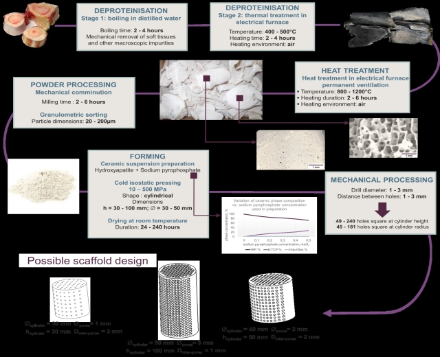 The proposed method consists of the fabrication of scaffold structures for major bone defect repair, based on monophasic (hydroxyapatite – HAP) or biphasic (hydroxyapatite + tricalcium phosphate – α-TCP or β-TCP) ceramics, which fulfill the product requirements related to mechanical strength and biocompatibility.