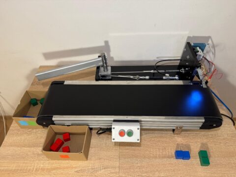 A prototype of a system for sorting objects by color has been developed, consisting of two main parts: a conveyor belt and a diverter mechanism. Unlike humans, who, thanks to their developed vision, easily recognize colors and shapes, in industrial production manual sorting becomes laborious, slow and unreliable in the long term, especially when it is necessary to maintain the same quality. In this system, an artificial pneumatic muscle is used to drive the diverter – a type of actuator developed through the combination of robotics and biology. The pneumatic muscle enables the diverter to rotate and represents an interesting technical solution for this application. When an object passes under a color sensor, the sensor recognizes its color. If the color is appropriate, the control unit activates the diverter, which redirects the object to the appropriate container. Objects of other colors simply continue along the belt and end up in another container. The entire sorting process includes: activating the valve, moving the object using the diverter, and then turning off the valve and returning the diverter to its starting position. Automation of such processes in industry greatly contributes to greater efficiency, accuracy and production speed.