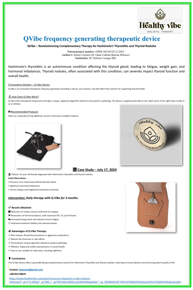 Hashimotov tireoiditis je autoimuno stanje koje utječe na štitnjaču, što dovodi do umora, debljanja i hormonske neravnoteže. Čvorići na štitnjači, često povezani s ovim stanjem, mogu ozbiljno utjecati na funkciju štitnjače i cjelokupno zdravlje. Q-Vibe je inovativni terapijski generator frekvencija koji pruža prirodno, neinvazivno i rješenje bez nuspojava za podršku zdravlju štitnjače.