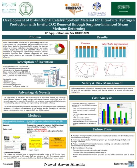 Ovaj izum predstavlja bifunkcionalni Ni/CaO-majenitni katalizator za sorpcijski poboljšano reformiranje metana parom (SE-SMR), omogućujući isplativu proizvodnju plavog vodika s uklanjanjem CO₂ in situ. Proces integrira katalitičko reformiranje i hvatanje ugljika u jednom koraku, postižući visok prinos vodika, smanjeni ugljični otisak, niže troškove i skalabilnost za održivu čistu energiju.